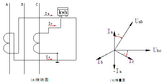 正确接线时的有功功率为:P=Pa+ Pc =UabIa.cos(30°+φa)+ Ucb.Ic.cos(30°-φc);