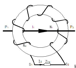 低压电流互感器的工作原理如图1所示,电流互感器的一次绕组串联在被测线路中,I1为线路电流即电流互感器的一次电流,N1为电流互感器的一次匝数,I2电流互感器二次电流(通常为5A、1A),N2为电流互感器的二次匝数,Z2e为二次回路设备及连接导线阻抗。当一次电流从电流互感器P1端流进,P2端出,在二次Z2e接通的情况下,由电磁感应原理,电流互感器二次绕组有电流I2从S1流过,经Z2e至S2,形成闭合回路。由此可得电流在理想状态下I1×N1=I2×N2,所以有I1/I2=N1/N2=K,K为电流互感器的变比。