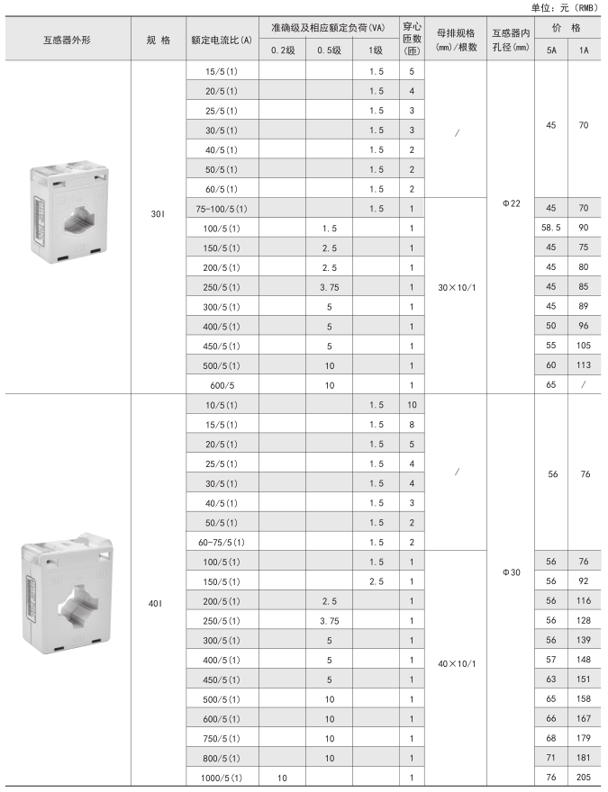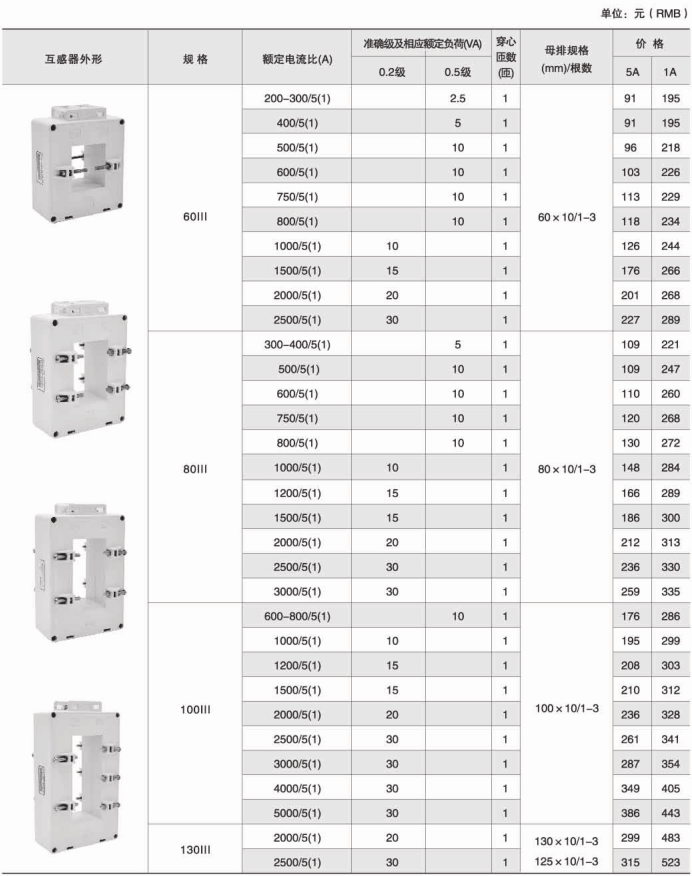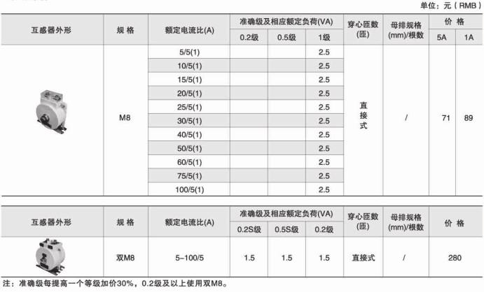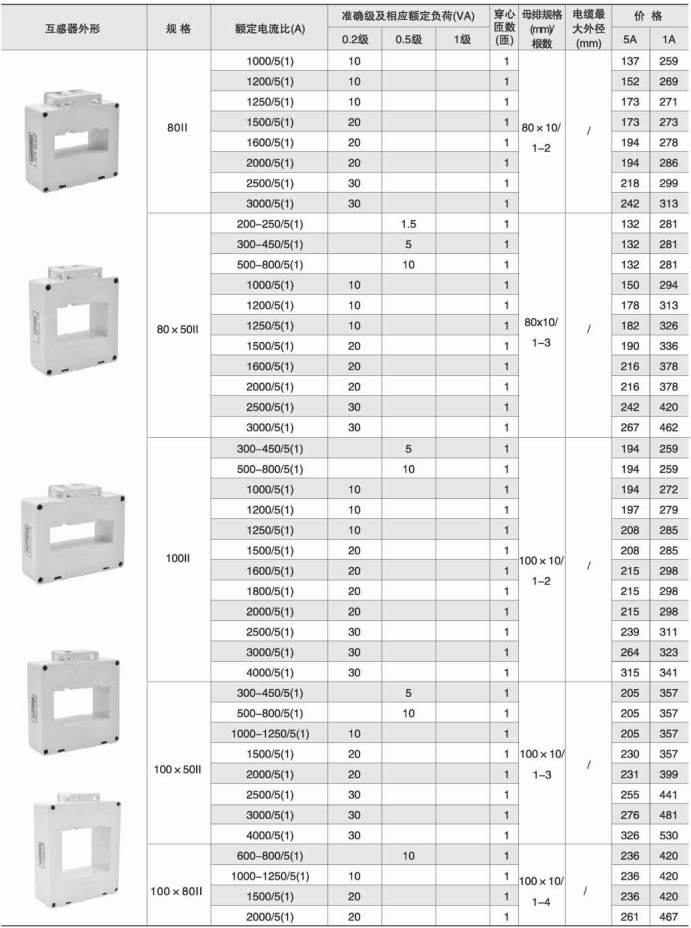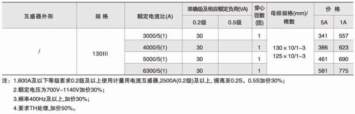 技术要求:额定电流比100A/5A; 准确级1级; 穿心匝数1匝;额定负荷1.5VA;内孔径φ22mm;穿排规格30mm×10mm 1根。