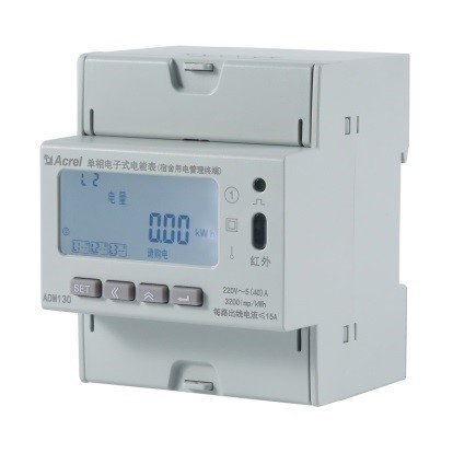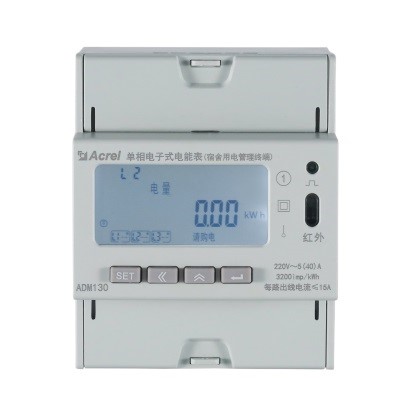 ADM130 单相电子式电能表(宿舍用电管理终端)主要用于计量单相交流用电,终端可以一路火线进线,三路火线并联输出分别计量照明、插座、空调回路,可进行预付费控制,并可对三路出线分别进行负载控制和时间控制并支持近30条跳闸事件记录存储功能,管理终端支持485和红外通讯,可方便地实现远程抄表、远程充值、远程控制等功能。